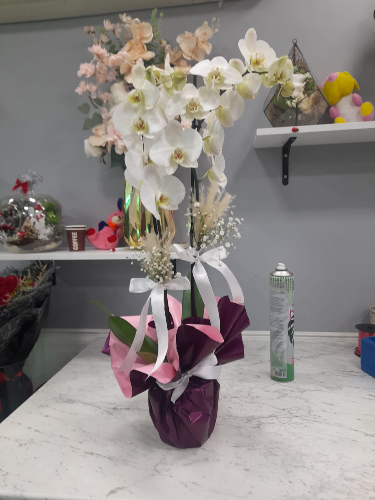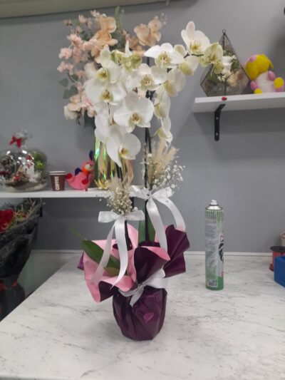 Çift Dal Beyaz Orkide Saksı