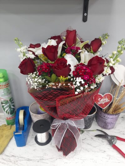 Kırmızı Gül (9 Adet) Lilyum Buketi